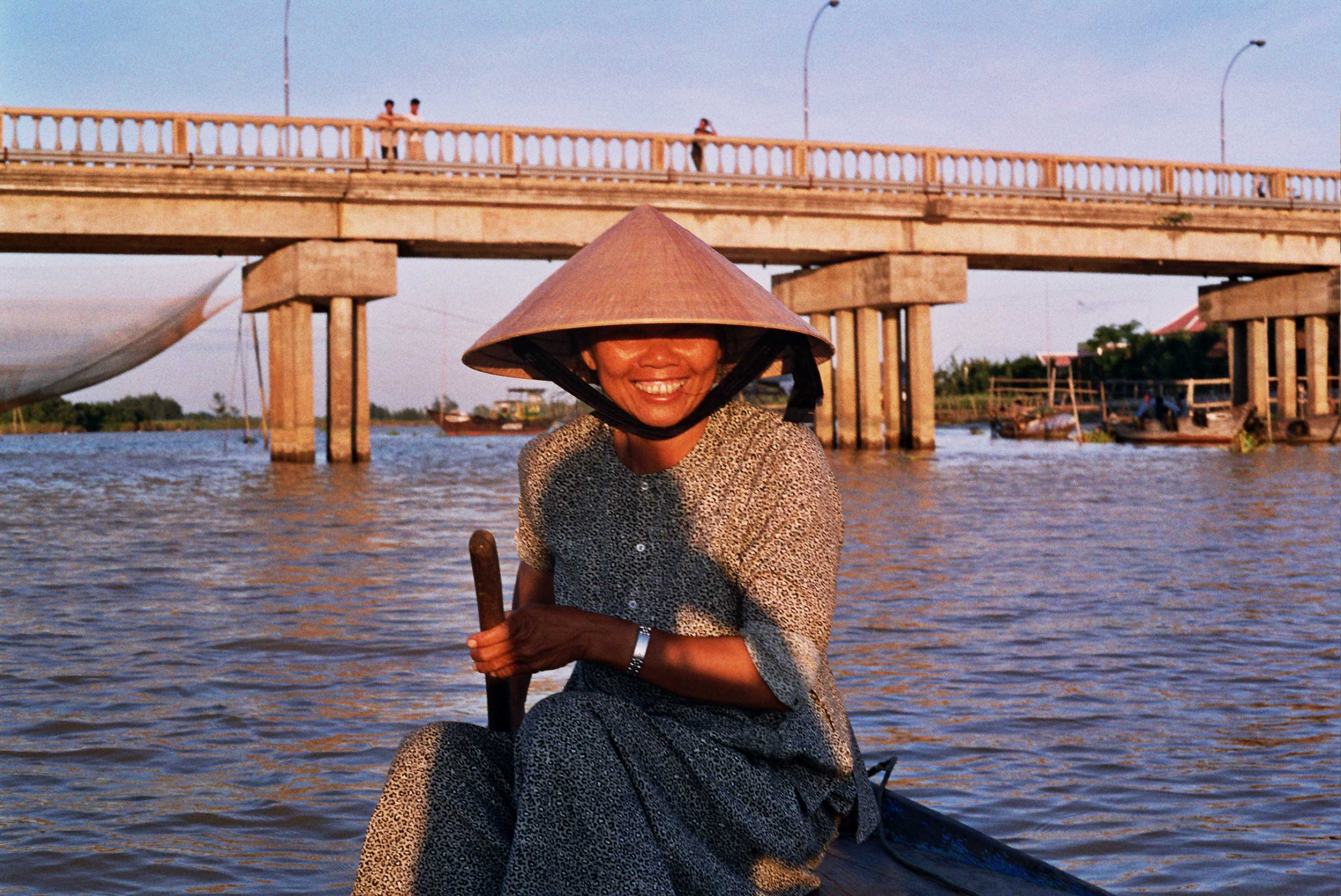 La llum daurada de l’ocàs banya la riba mentre llisquem per les tranquil·les aigües del riu. En una barcassa sense motor ella va remant impassible, sense pressa ni pausa, ens mira i somriu, amb un somriure ampli i adorable que t’obliga a tornar-li. Viu sota el pont pel qual passejàvem quan ens va abordar, ella, petita i riallera per convèncer-nos de portar-nos a voltar pel riu. La falta d’experiència, la desconfiança en preguntar-li el preu i demanar-nos la voluntat i el desconeixement va fer dir-li inicialment que no, però gràcies a la seva insistència acompanyada d’un somriure suau i bondadós li vàrem prometre tornar al dia següent a la tarda. I allà la vam trobar, esperant i corrent cap a nosaltres quan ens va veure aparèixer pel pont, rient i mostrant una alegria desbordada. Vam arribar a la barcassa darrera d’ella a través d’un entrellat de troncs que feien de passarel·la.