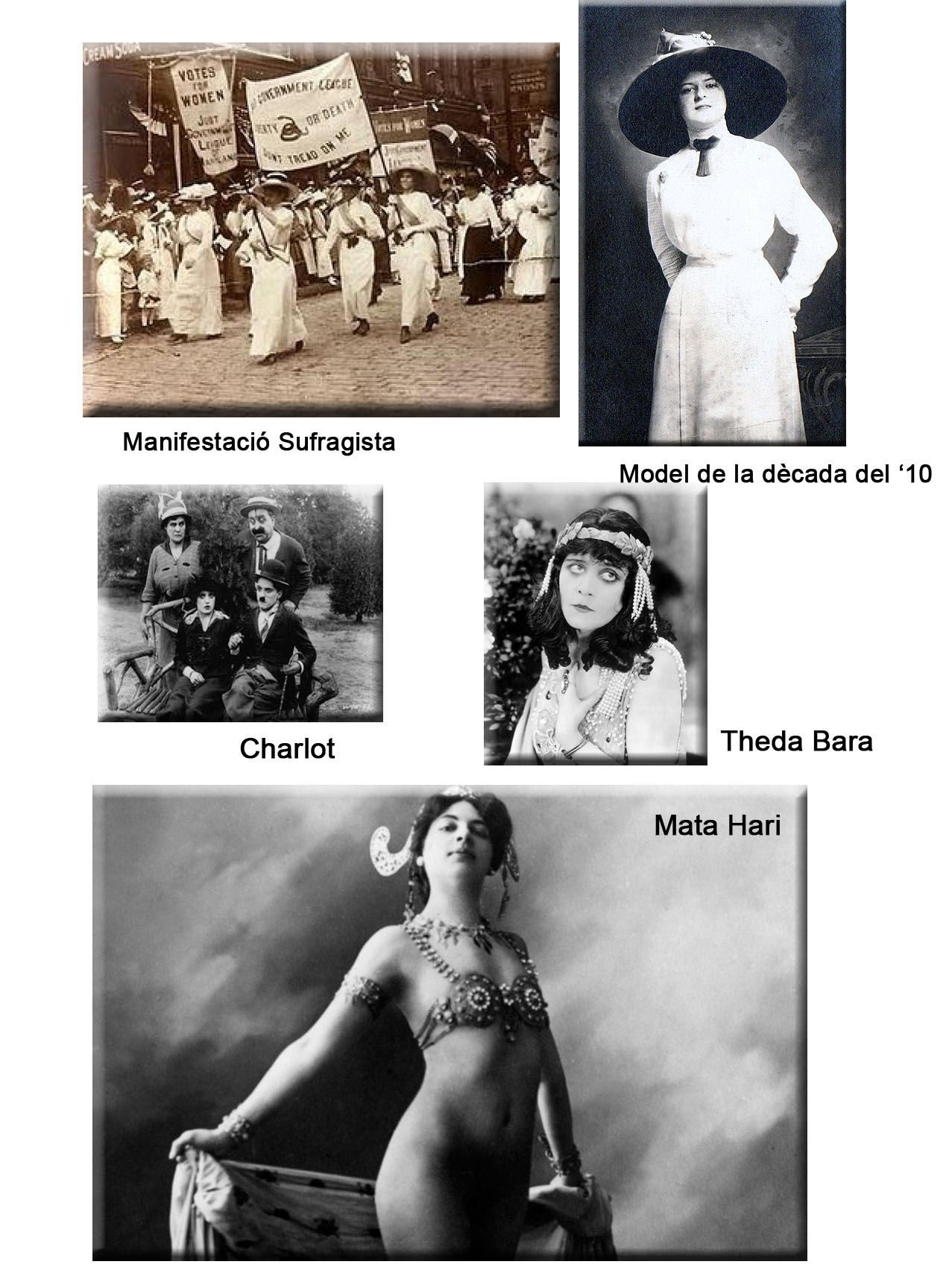 Al Juliol de 1914 esclata la Primera Guerra Mundial. La lluita de les sufragistes es troba al punt mig del seu camí. En cinema Charles Chaplin crea el personatge de Charlot i roda 35 curtmetratges al llarg de l’any. S’estrena The Stain a on debuta en un paper d’extra Theda Bara (Theodosia Burr Goodman, 1885-1955) una de les actrius representatives en la dècada del cinema mut. Sorgeix la figura de la Vam com a dona seductora i icona eròtica. Margarete Geertruida Zelle (1876-1917) més coneguda com a Mata Hari es mostra al món amb una sensualitat i erotisme trencador per la societat encotillada i reprimida ancorada en els convencionalismes de l’època. Una societat que troba les vies d’escapament al moralisme rígid en l’aparició i consolidació dels espectacles de varietats. Trobem, per tant, un primer xoc estètic i moral entre l’estètica pròpia de l’època i l’acceptació d’un nou model eròtic. A pesar d’això, aquest nou erotisme es mostra amb una pàtina d’exotisme probablement influenciat per la preferència estètica de principis de segle per l’art oriental, una pàtina que ens mostra a aquestes dives dins d’una imatge idealista proper a un punt d’innocència.