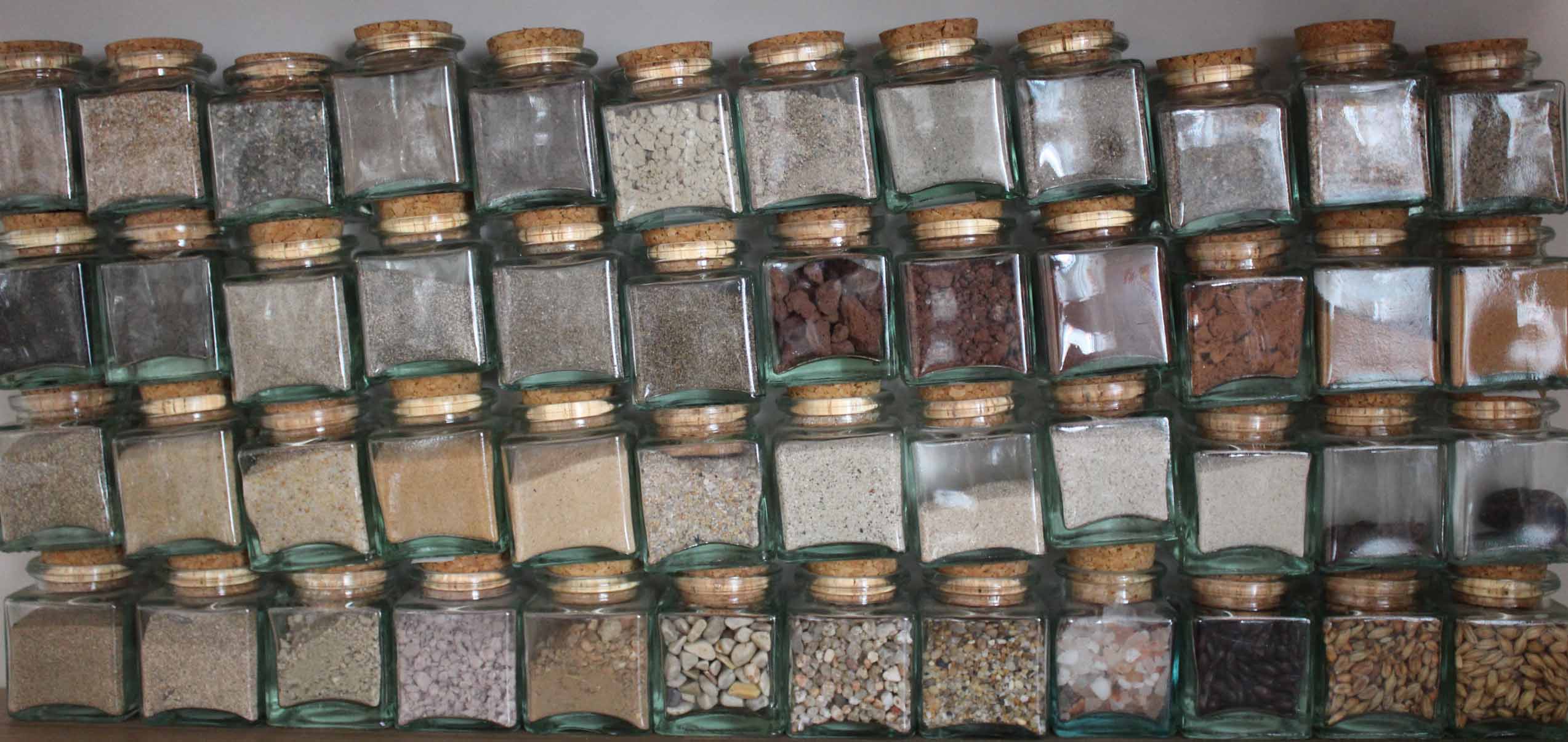 Sorprenen gama de colors; marrons, beixes, vermellosos, blancs, negres, marengos, grisos i fins i tot morats. Tantes textures com mostres, sorres increïblement fines, fangoses, amb pedretes, amb pedres i amb pallufetes, amb tots els grans del mateix color o amb mil colors diferents dins de la mateixa mostra… Coincidència de colors i textures de terres de diferents parts del món, les blanques terres del Carib es confonen amb les fines sorres de Desert Maurità, les negres terres volcàniques de Lanzarote s’assemblen a la terra de pissarra del Pirineu, la terra de la necròpolis de Chauchilla al Perú és exactament igual que la sorra d’Eivissa…