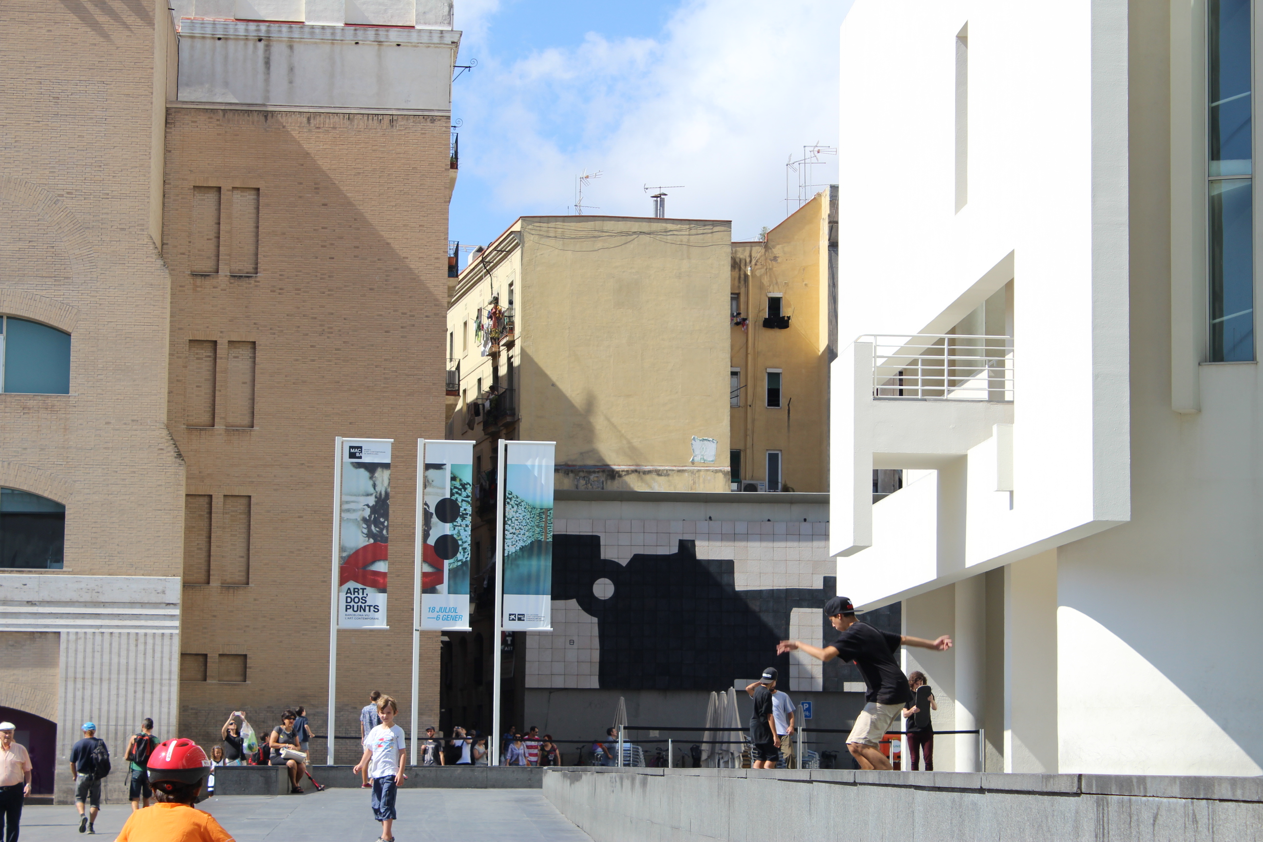 Un mural de 15.55 metres de llarg per 5.9 metres d’alt cobreix la mitgera de l’edifici que franqueja el lateral del MACBA, en el cor del Raval. Eduardo Chillida es decidí a cobrir-lo per la impressió negativa que li havia causat la paret gris enfront del blanc edifici de Richard Meier. El fet deixava palès la dificultat d’integrar la imponent mole blanca a la realitat del barri.