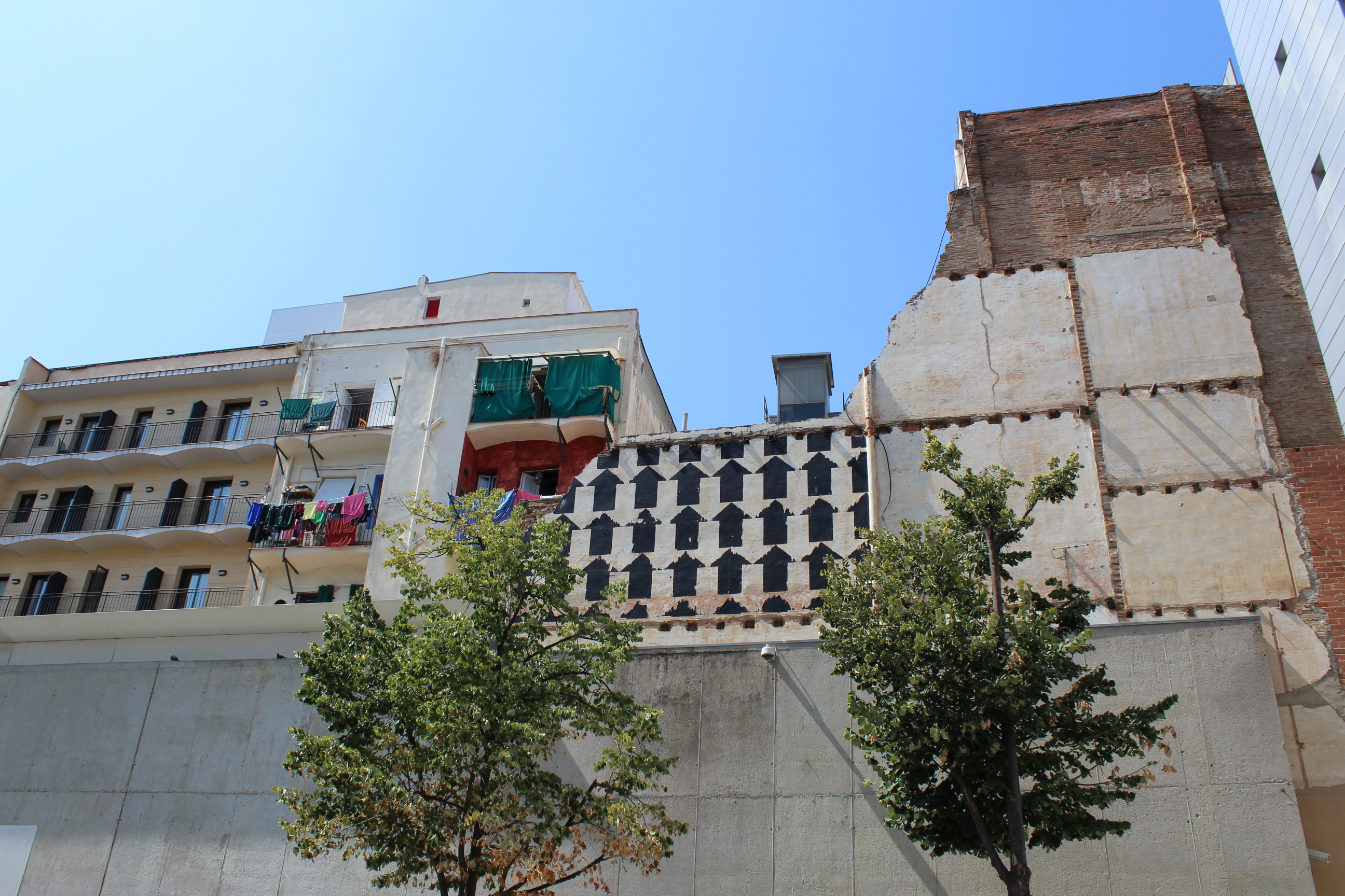 MitgeresAquesta mitgera em provoca molta curiositat, al costat del mural del Chillida, apareix com una actuació improvisada però dubto que sigui fruit de la casualitat, ocupa una part força deixada de la paret general, diverses parets d’un edifici enderrocat i un d’ells amb aquestes fletxes disposades de manera ordenada i lineal, enfocant cap al cel…