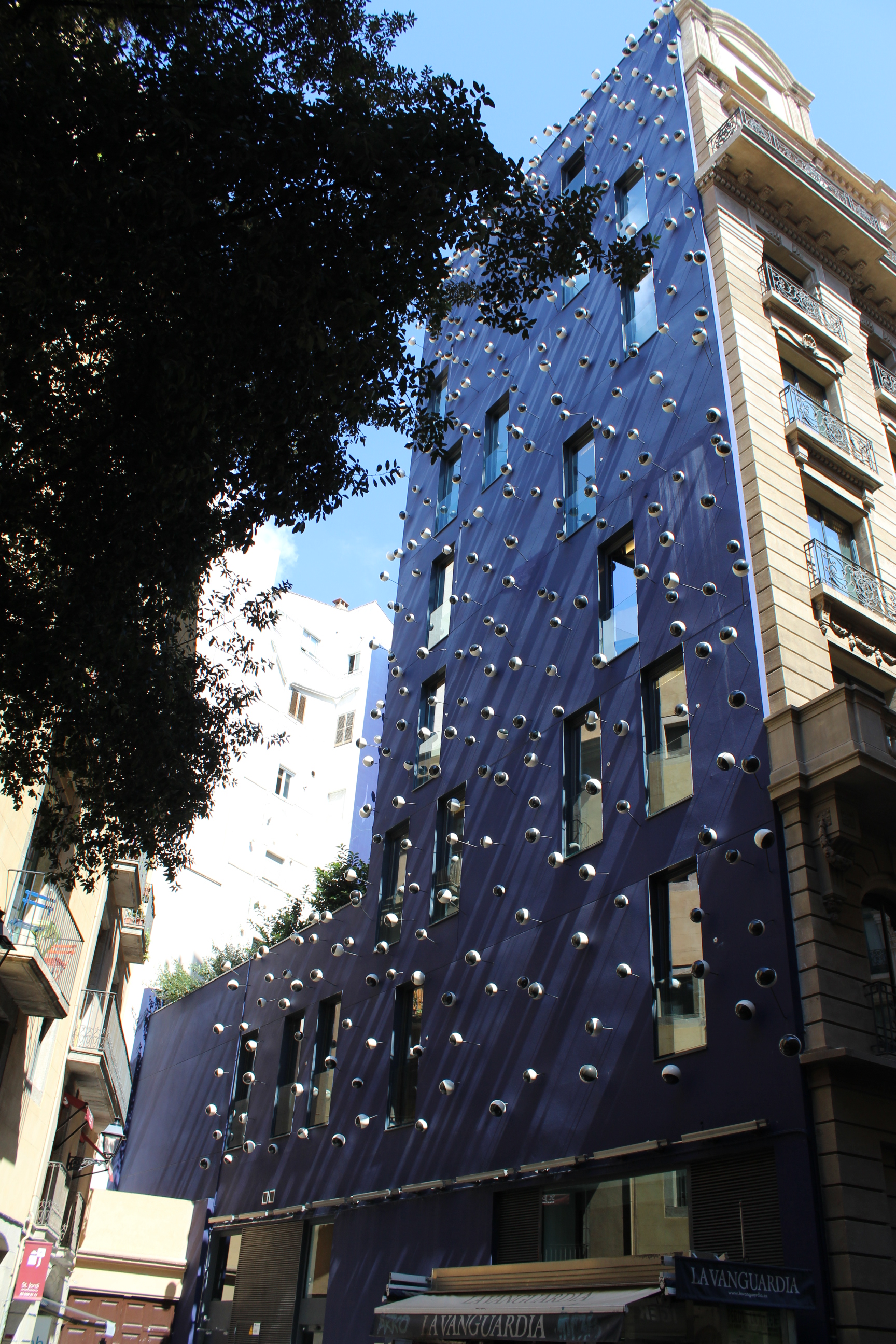 El edificio es un hotel y está intervenido tanto a la medianera de la parte trasera que da en la calle Condal cono la fachada en Vía Laietana. El recepcionista del hotel me ha comentado que era una obra de Frederic  Amat, pintor que trabaja también la escultura, los medios audiovisuales o en el ámbito arquitectónico.