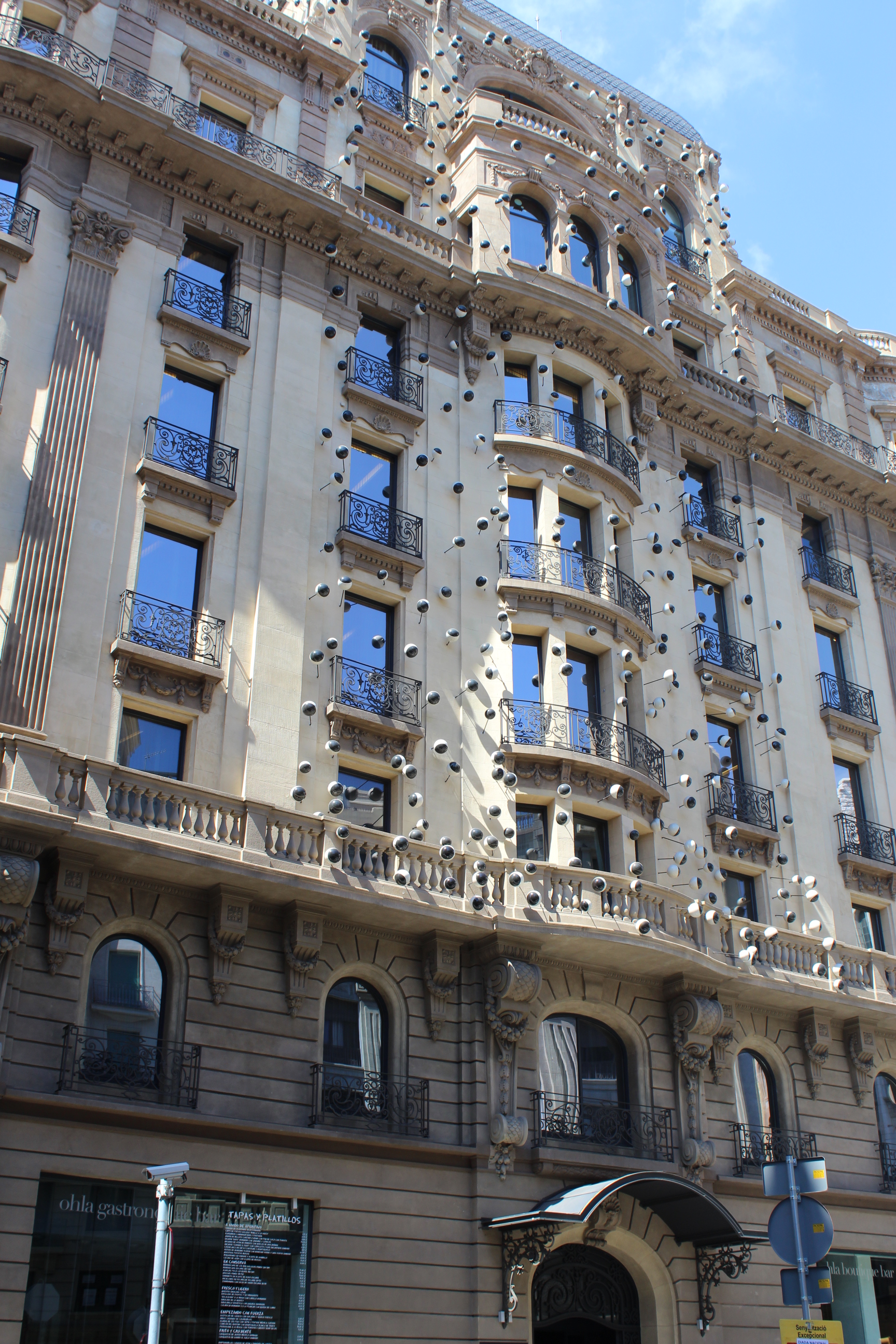 L’edifici és un hotel i està intervingut tant a la mitgera de la part del darrere que dóna al carrer Comtal con la façana en Via Laietana. El recepcionista de l’hotel m’ha comentat que era una obra de Frederic Amat, pintor que treballa també l’escultura, els medis audiovisuals o en l’àmbit arquitectònic.