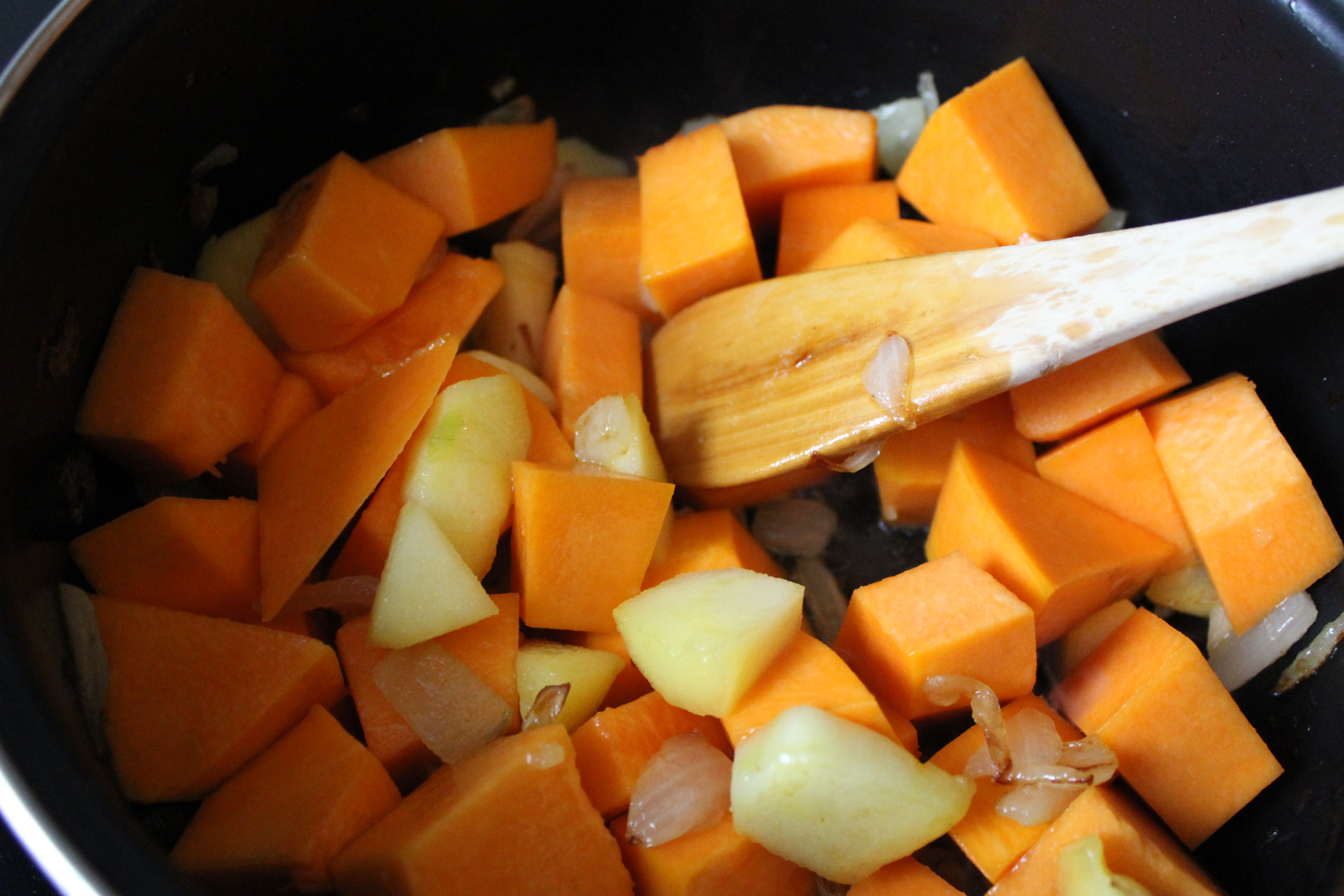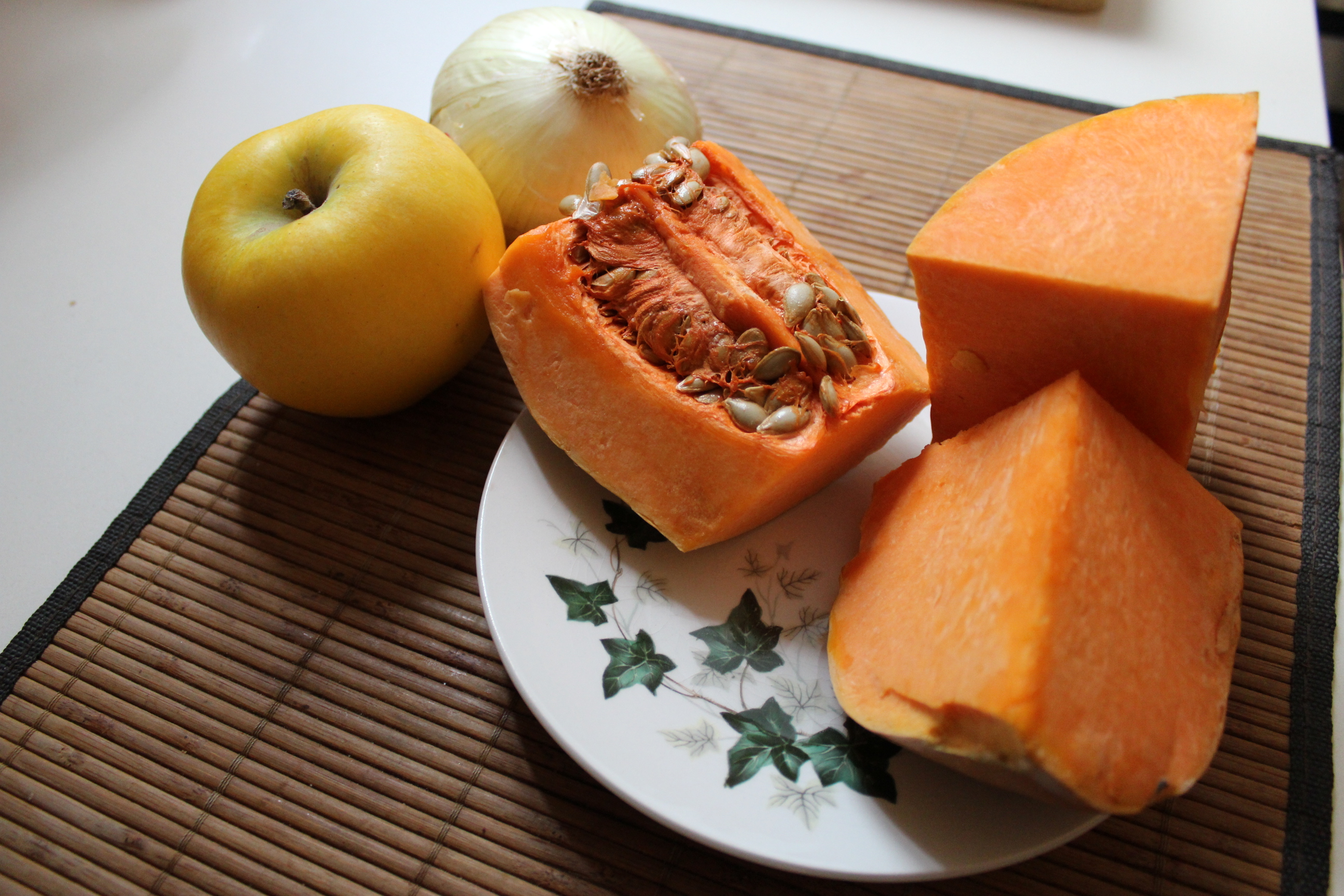 A mí me gusta muy sencilla, una cebolla sofreída, media manzana cortada a trocitos y volteada un poco con la cebolla. La calabaza cortada a dados, mezclada con el sofrito, agua cubriendo justo, un poco de sal y nada más, ni caldo de verduras, me encanta como queda tal cual… Os animáis? Buen provecho.)