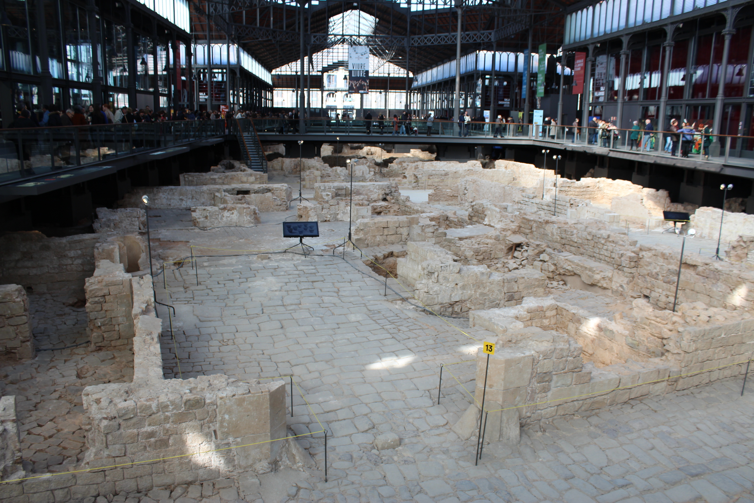 La majestuosa estructura de hierro del antiguo Mercado del Borne se levanta ante nosotros y acoge nuestros pasos al traspasar sus puertas. Entrar a su interior tiene algo de mágico, de ritual iniciático, de traspaso a un espacio diferente, a otra dimensión, te envuelve un aire tocado por la luz especial que atraviesa los vitrales, sus dimensiones te empequeñecen. Avanzando aparece delante nuestro la barandilla que marca el perímetro de las ruinas excavadas a un nivel inferior. El peso de los colores marrones y beiges de la piedra se contrapone con la ligereza del hierro fundido, de la madera del tejado sujetado por una telaraña de hierro.