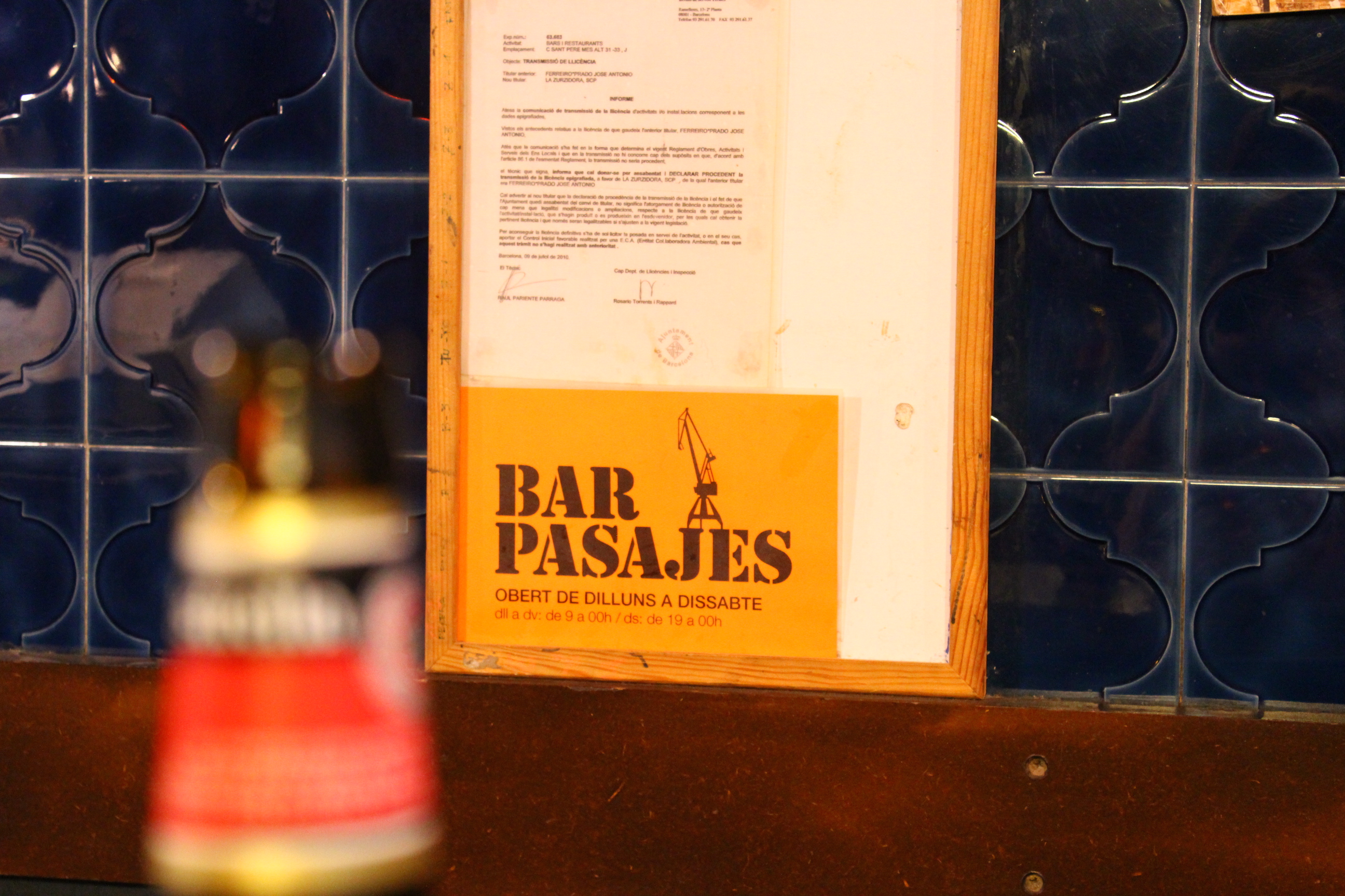 En un petit passatge que va de Sant Pere més alt a Trafalgar trobem un petit tresor. Els petits locals d’un quiosc i una «zurzidora» s’han afegit a l’antic bar, creant un espai força peculiar. Tenen un extens horari, es pot fer el vermut, prendre una copa o dinar o sopar lleuger. La gent que el porta és molt agradable. Un espai especial se’ns dubte.