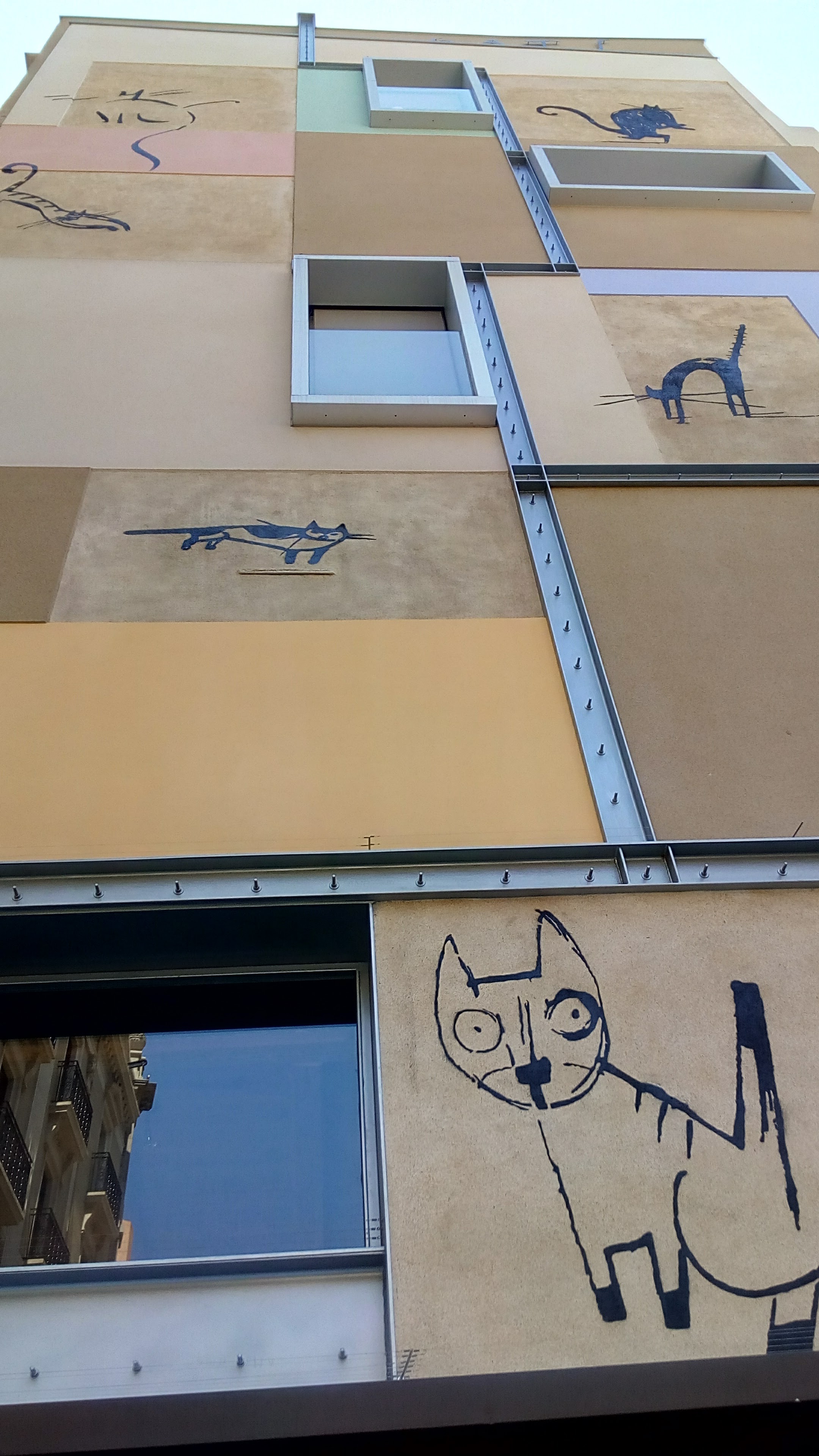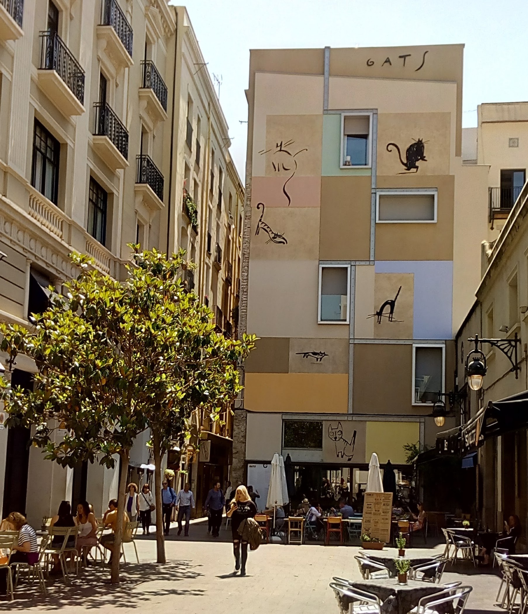 Quan vaig iniciar aquest blog i vaig decidir que un dels temes a cercar eren les mitgeres, l’única que tenia al cap era aquesta, amb els seus gats, però va resultar que estava tapada amb bastides. Ara, un altre cop a la vista, converteix un petit racó anodí en un espai pintoresc i agradable. Indagant qui era l’autor he descobert què s’amaga darrere d’aquest Mur dels Gats i m’ha induït a pensar que, el Raval és un Gat.