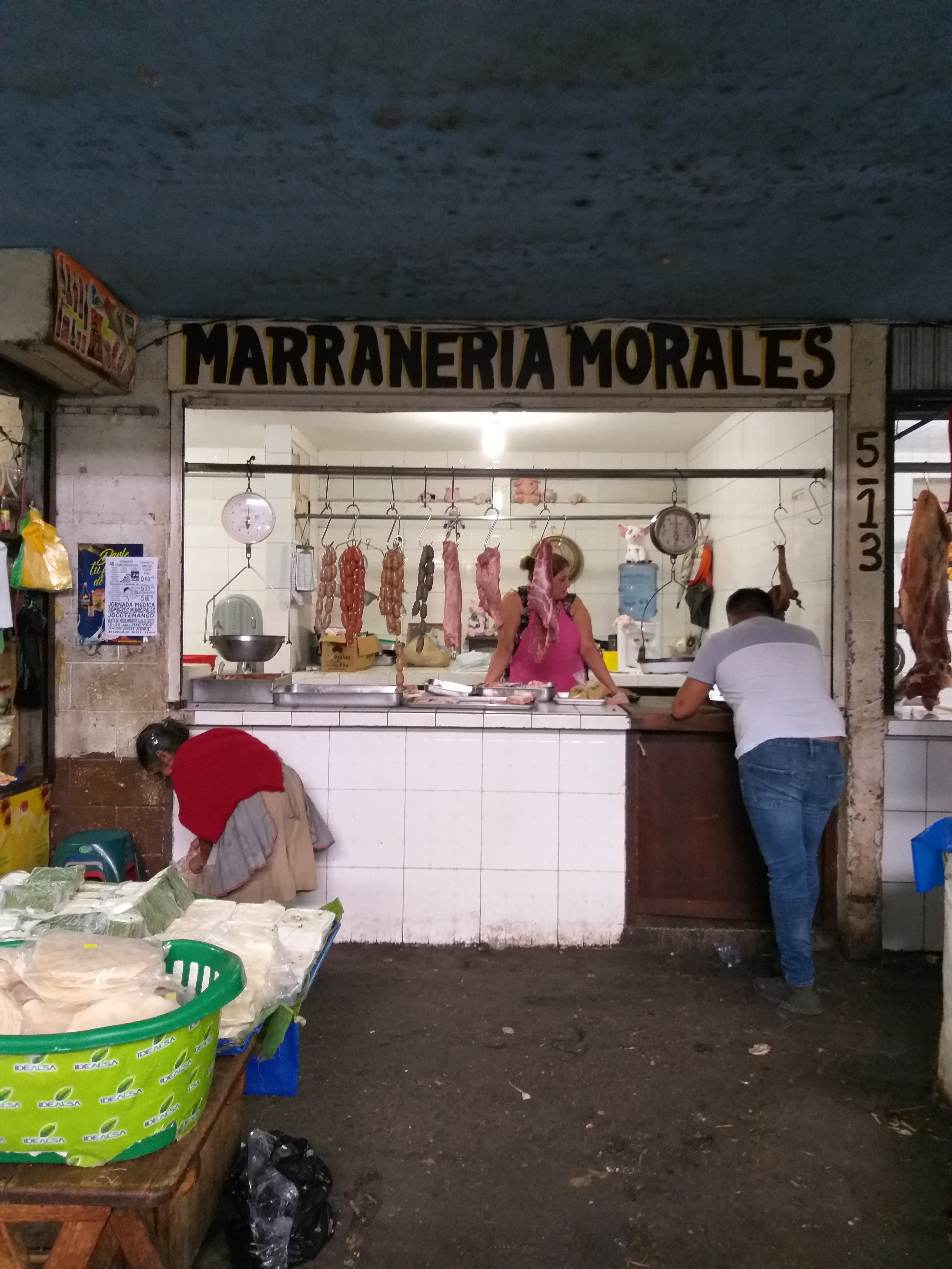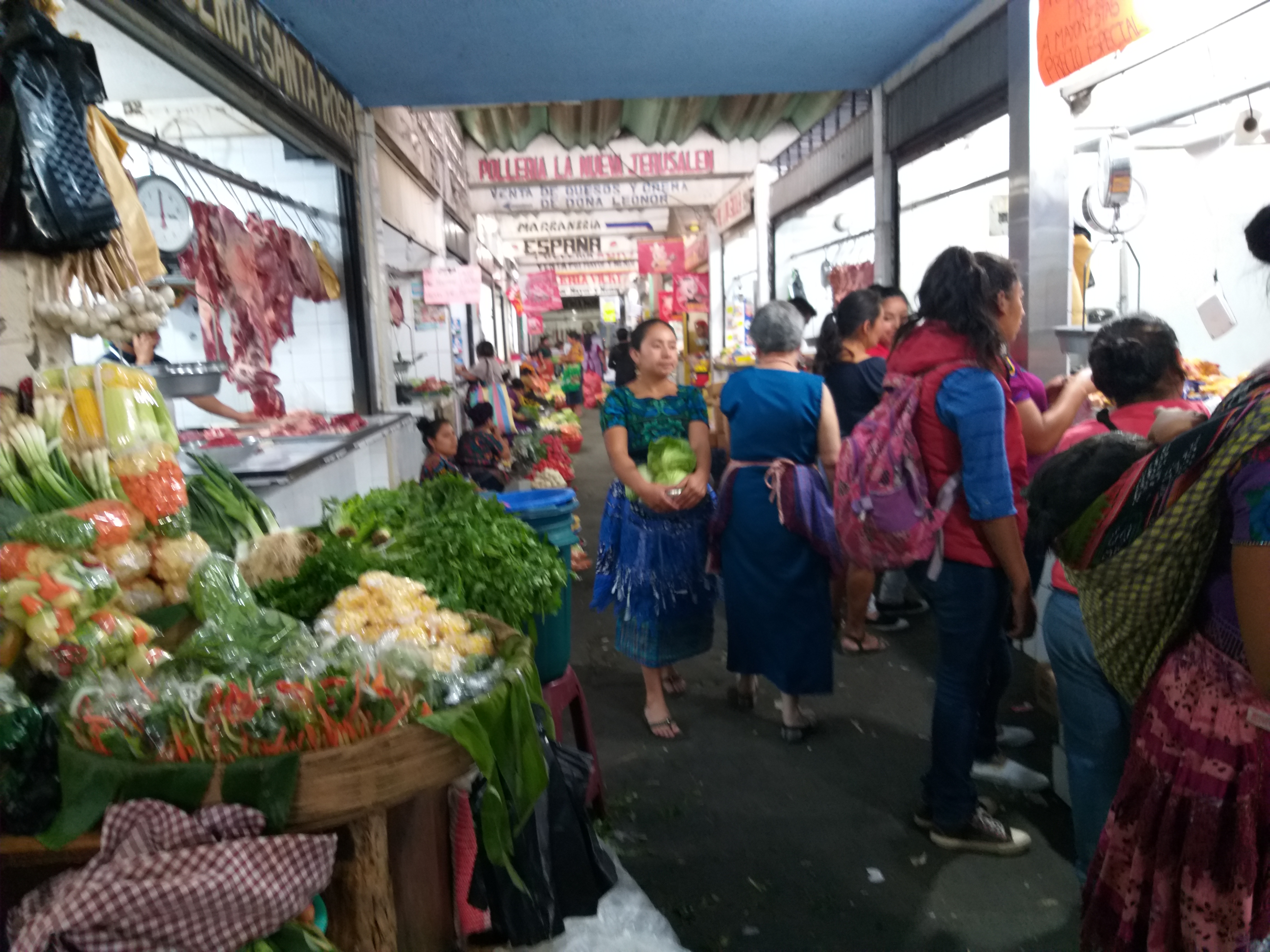 He dinat en una terrasseta plena de plantes i em plantejava si tornar a l’allotjament, principalment per treure’m les vambes  que portava els peus covats, quan m’he topat amb un mercat immens, amb una gran part coberta i molt laberíntic, increïblement enorme, ple de passadissos  on es barrejava parades de roba, de catxarreria, de carn, de peix, de fruita, de parades de menjar… He al•lucinat bastant i m’he plantejat si tanta oferta tenia prou demanda. Molta gent activa a les parades cercant l’atenció de possibles clients, cantant les ofertes o preguntant que busques…però també molts morts de fàstic. Un espai acolorit i variat, amb mil olors d’herbes i d’espècies, de carn i peix, amb gossos mirant que poden arreplegar i amb la brutícia típica d’aquests tipus d’espais. Per acabar-ho d’arrodonir al costat hi ha l’estació (per dir-ho d’alguna manera) d’autobusos. Un espai ple de «parrilleras» vells autobusos escolars nord-americans reciclats com a autobusos locals. En cada bus un noi va cridant la destinació i surt quan està ple. Un espai ben caòtic.