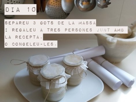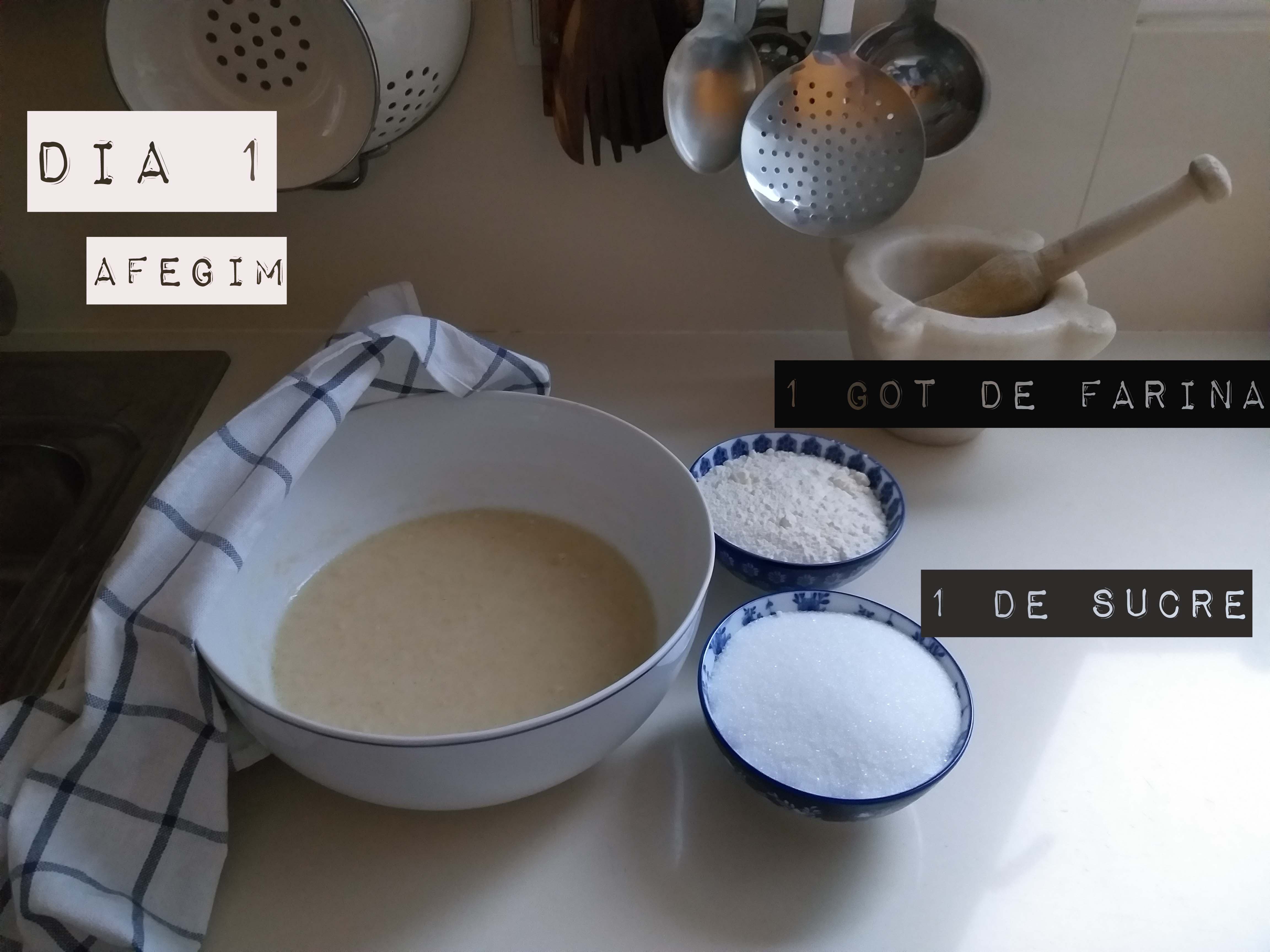 Tradicionalment, aquest pa de pessic es realitza amb una massa mare que algú et regala en un got, desitjant-te d’aquesta manera bona sort. Però si no coneixes a ningú que et pugui passar un, hi ha la possibilitat de realitzar-za el dia anterior. Un cop acabat el procés et trobaràs amb tres gots de massa mare que podràs regalar, juntament amb la recepta, o bé congelar per futurs usos. Aquí teniu la recepta pas a pas.