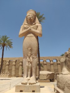 La següent parada ha sigut el temple funerari de la única faraona dona que va existit, la Hatshepsut. Les males llengües diuen que el temple li va construïr l’amant que era arquitecte. Un dels relleus és una nena petita bevent llet d’una vaca sagrada, símbol del seu origen diví i apa, ja tenim al poble convencut. Es veu que va fer portar arbres de tota Àfrica i va crear un gran jardí. Actualment només queda la soca d’un cilandre. Segons la guía aquest és un dels llocs més calent del planeta i hi dóno fe. La matxacada ha sigut considerable perquè el temple apareix en una gran explanada i s’hi puja per enormes rampes. Per a mi ha sigut massa dur. La veritat. Molt important anar ben banyat en crema solar, portar gorra i ulleres de sol. Si ho aguantas no és mala idea portar una camisa fina de màniga llarga. Molta aigua malgrat acaba asquerosament calenta.