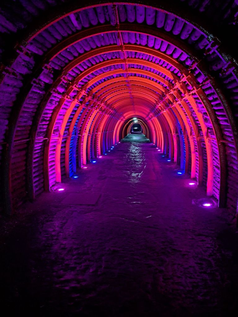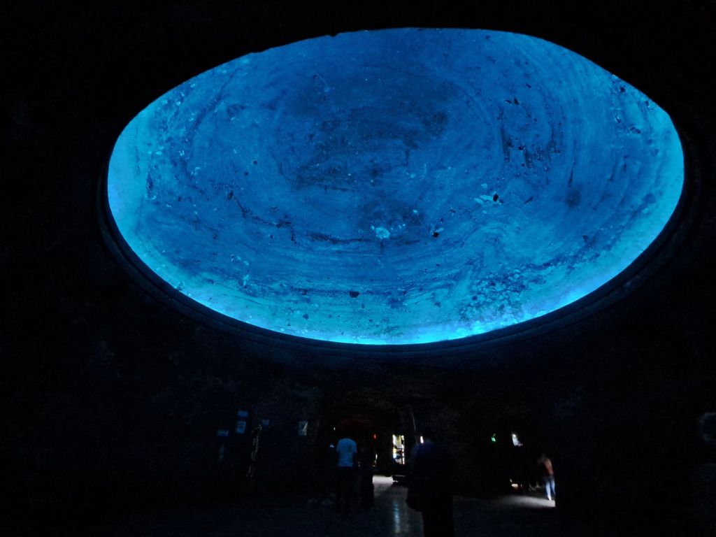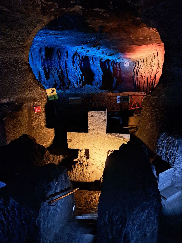 A l’entrar et trobes un camí amb entrades/miradors als túnels on han creat un Via Crucis. L’audioguia principalment t’explica el via crucis de Jesús. A mi de primeres quasi m’agafa urticària perquè jo esperava explicacions de la mina. Però al cap de poc, com a la tercera o quarta parada doncs t’adones que allò realment és una catedral i està dissenyada com a tal, plena de simbolisme. Durant tot el Via Crucis utilitzen la forma de la creu com a metàfora del que pasa a cada parada. Les creus són de sal i van ser els mateixos miners que van tallar-les juntament amb cada espai on estan. Tot això està en un primer nivell. Conforme s’avança es pasa per un lloc que hi ha una cúpula i després es baixa per accedir a les tres naus principals. La veritat és que és impressionant per les mesures. Cada sala fa 50 metres de profunditat per 17 metres d’alçada. Tot això amenitzat amb una sort de jocs de llums led de diversos colors.