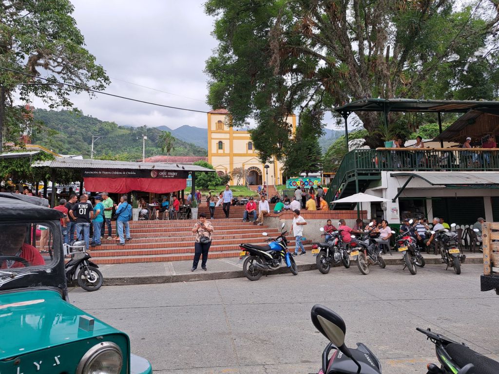 Sortint d’aquí volíem anar a Córdoba. Com que el gps perd senyal, has d’estar molt pendent de motos i el paisatge és brutal doncs m’he passat un desviament. Però ho hem pogut solventar ràpid, això ens ha passat un parell de vegades. La carretera a Córdoba també ha estat espectacular, en alguns trams l’asfalt està destrossat i has d’anar amb compte amb els socavons. Aquest poble potser no és tan macu com Pijao però és curiós que a la Plaça Major hi ha un munt de gent reunida, sobretot homes, allà d’en peus petant la xerrada, també famílies amb nens i llocs de refrigeris varis escampats per tota la Plaça. Això és repeteix en molts llocs.
