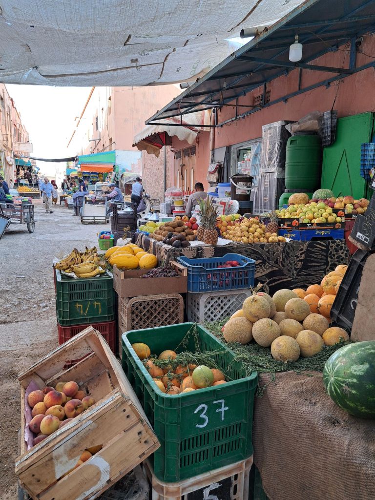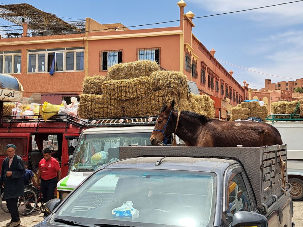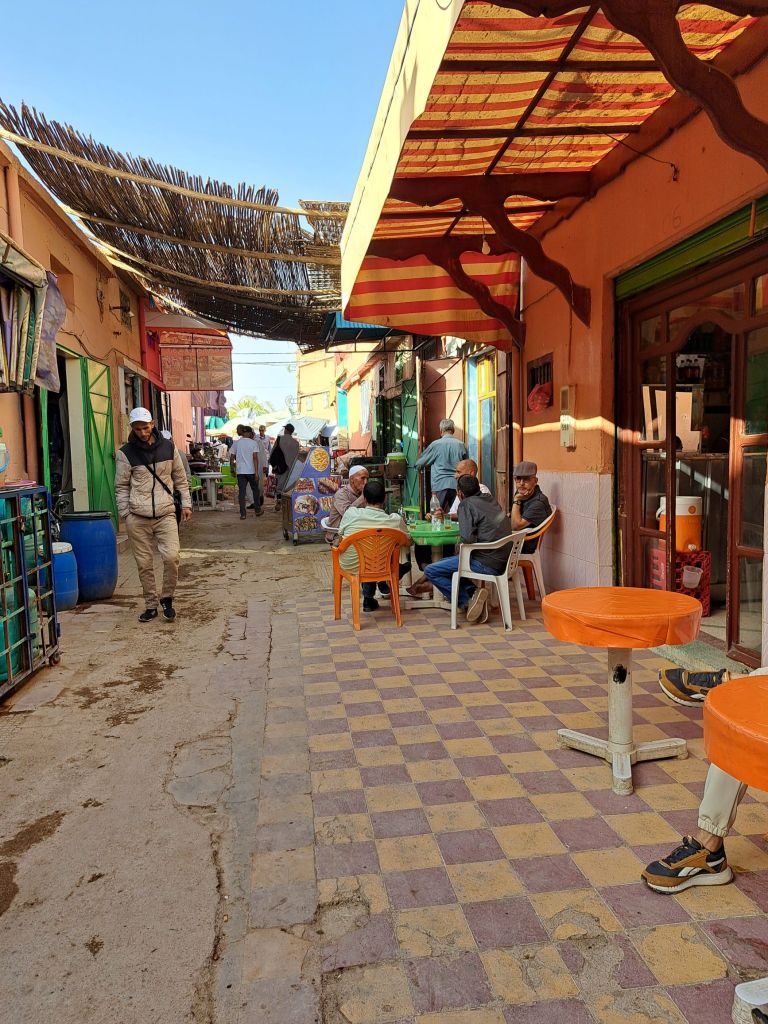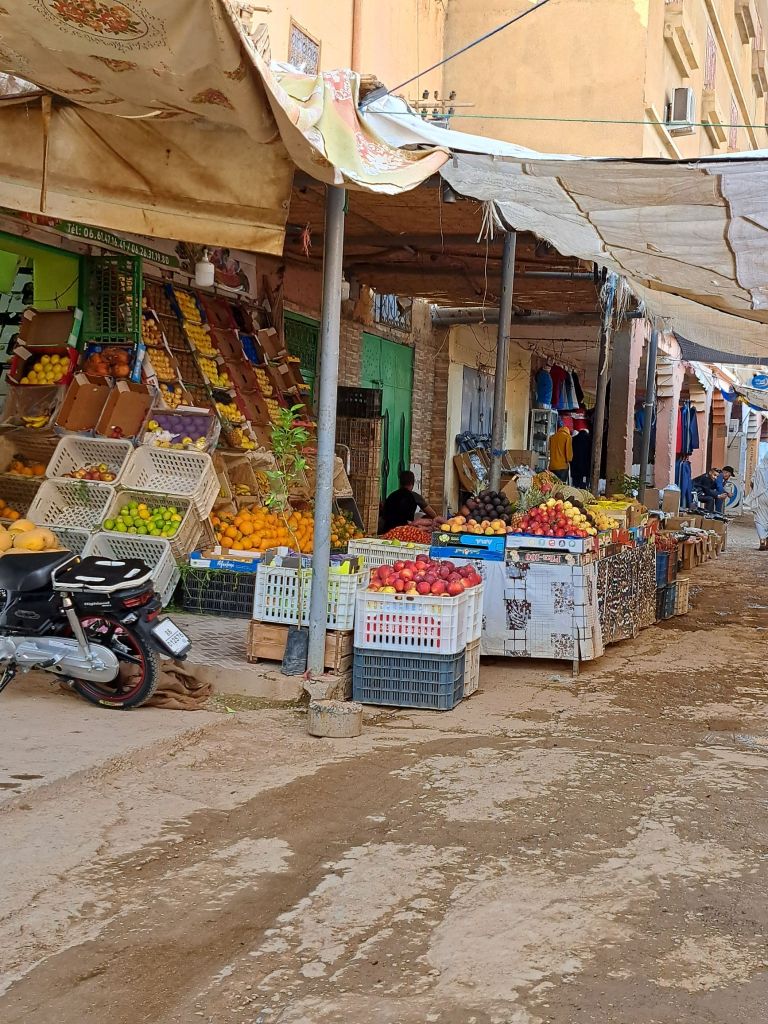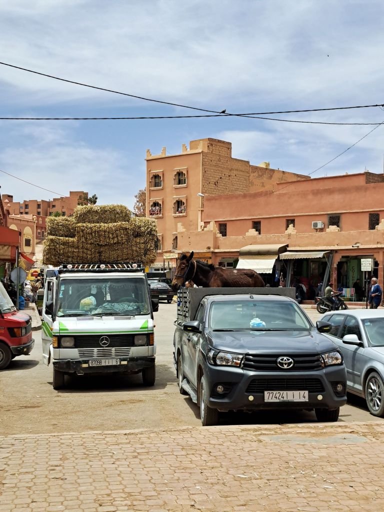Decidim marxar cap a les Gargantes del Dades però quan mirem la distància estan a més de dues hores i se’ns cau el món a sobre. Més pallisa de cotxe. Descartem anar-hi i decidim visitar la Vall del Dades a on hi ha la Vall de les roses. Arribem al poble principal de la Vall de les roses, Kalaat M’Gouna. Aquesta zona és famosa per la producció d’un tipus de rosa, més petita de la que coneixem nosaltres, amb la que es fa oli, aigua, esencia i sabons. A finals de maig fan una gran festa de tres dies. Nosaltres veniem amb la idea de trobar grans extensions de rosers plens de roses. De primeres parem al poble i voltem per viure l’ambient. És un poble grandet i hi ha molt d’ambient al carrer. Moltes botigues i el mercat.