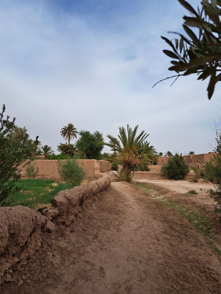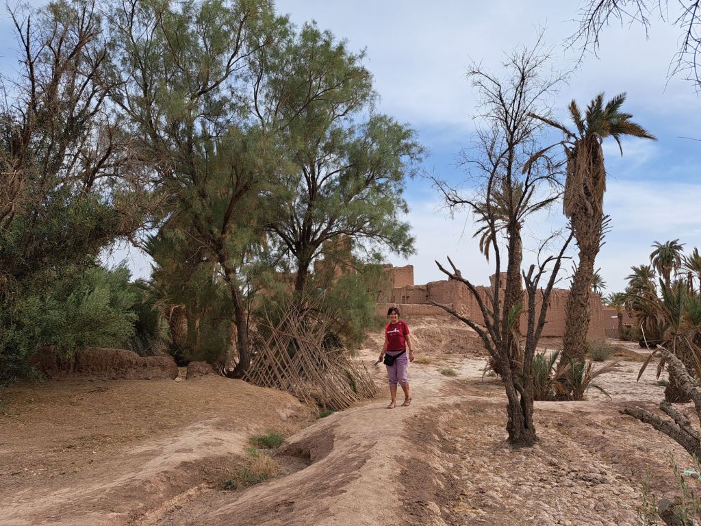 La següent parada és Skouda, famosa pel seu palmeral de 24 km2. De primeres, en arribar al poble, no sabem ben bé que fer. Agafem un carrer lateral pensant que s’endinsa cap a l’interior. De seguida un senyor en moto se’ns planta al costat i en frances ens parla del palmeral fent-nos senyes com per seguir-lo li diem que no, que anem pel nostre compte. Arranquem i comença a seguirnos. Tornem a parar fent veure que busquem alguna cosa amb el mòbil esperant que ens pasi i es para davant del cotxe. Ens va costar treure-ns-el de sobre. I ens va donar com mal rotllo. Seguim el camí i trobem cases d’adob diseminades entre la vegetació. No ho veiem ben bé com un palmeral. També hi han arbres d’altres classes. I tot una mica pobre de vegetació. Decidim marxar i sortint del poble si que es veu una gran extensió però les palmeres estan en males condicions i pensem que és degut a la sequera.
