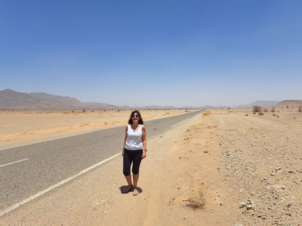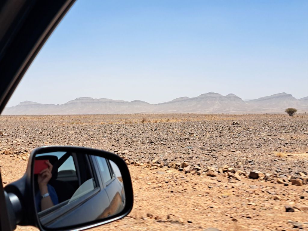 Per endavant un camí de 4 hores a través d’una zona àrida i enorme on simplement, no hi ha res. A meitat de camí el gps ens desvía cap a una població força gran on aprofitem a comprar aigua. Seguim camí i de cop i volta estem tornant per la carretera per la que haviem vingut arribant a la cruïlla…una mica com la dimensió desconeguda. En algun moment haviem perdut la connexió. Seguim recte perquè s’ha redirigit i creiem que vam agafar el camí més llarg. Igualment el camí va estar interessant, observant un paisatge desolador tan diferent a altres zones del Marroc.