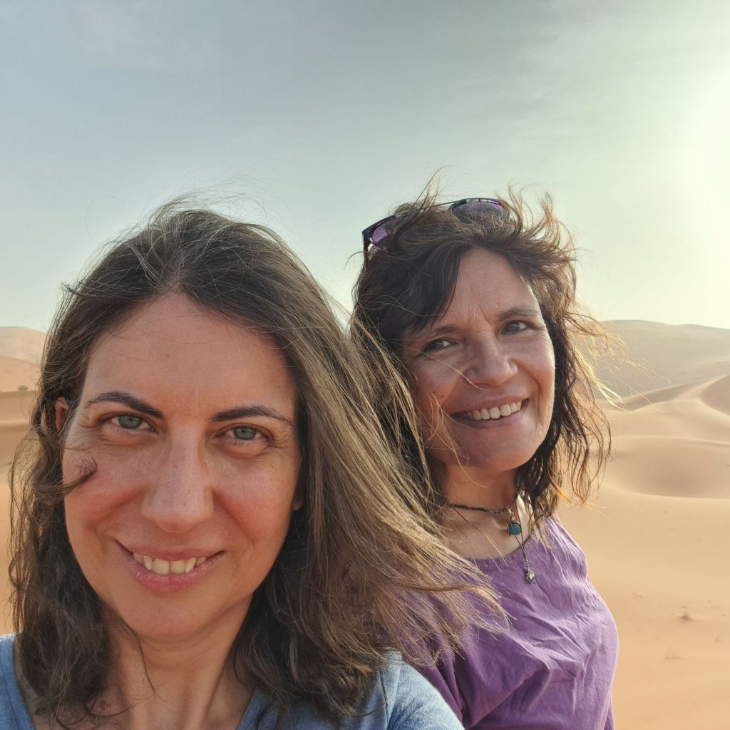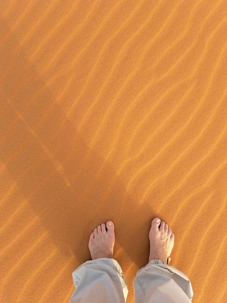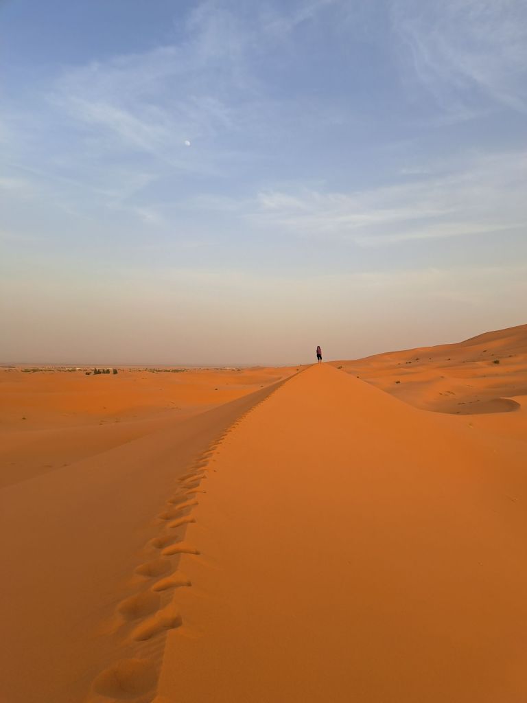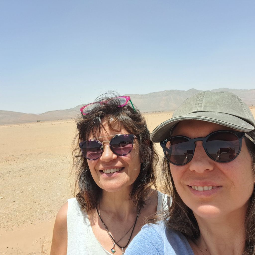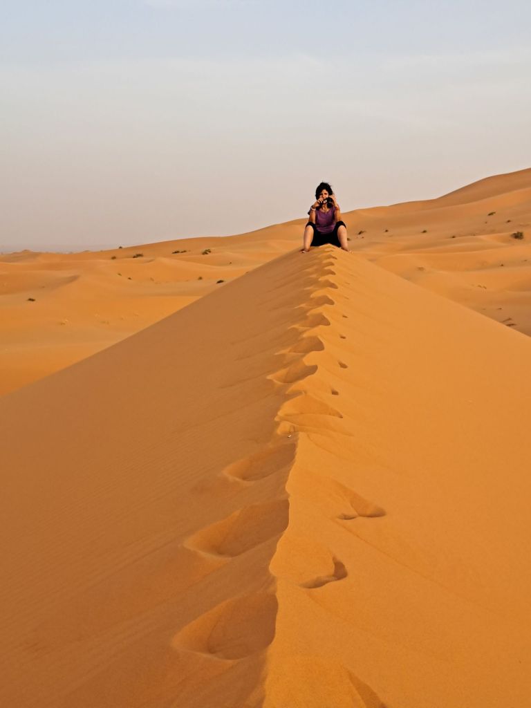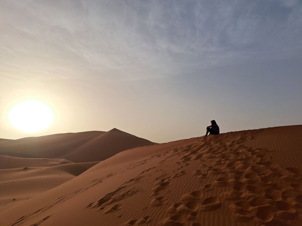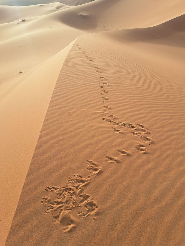 Quan arriba Omar, un altre Omar, tenim el de Zagora i el de Mezouga… ens ofereix portar-nos a una duna i deixar-nos allà per veure la posta de sol unes hores. Mentre portarà a una parella amb un nen de dos anyets a agafar uns dromedaris i anirà a buscar un grup de 5 i ens juntarà a tots. De primeres ens quedem una mica parades en plan que vols que fem unes hores allà. Omar és molt macu però molt impacient. Ens diu que si no, podem esperar a l’hotel i diem que això no. O que podem fer quats. Com que ens veu dubtar s’impacienta i comença: a veure a vosaltres us avorreix anar a les dunes,us avorreix quedar-vos a l’hotel, no voleu anar en dromedari… i li diem ei tranqui que només ho estem valorant. Entre nosaltres ho parlem i ens fem a la idea de que no estarà tan malament estar soles unes hores enmig del desert. Li preguntem si hi haurà més gent i ens diu que si volem estar soles ens buscarà unes dunes només per nosaltres i trobem que la idea és genial. De camí deixa a la parella amb els dromedaris i entra directe a les dunes. Ens trobem a la entrada al desert. Venim d’un territori pla i desolat de pedres negres on començen, imponents les primeres dunes del Sahara. Omar ha nascut a la zona i porta tota la vida recorrent el desert. Durant una bona estona puja i baixa les dunes cap aquí i cap allà davant del nostre entusiasme. Finalment ens deixa en una petita hondanada enmig de varies dunes i marxa. El primer que fem és treuens les bambes i sentir la finura de la sorra a les nostres pells. L’entorn és increïble. El silenci impressionant. Descobrim emprentes de petits animals, segurament guineus i ratolins del desert. Pujem a aquesta cresta o a aquesta altra, descobrim el dificil que és caminar per la sorra. A estones riem fent el burro. A estones estem cadascuna al seu rotllo assegudes aquí o allà gaudit d’aquella inmensitat de sorra daurada i silenci sobrecollidor. No m’enganyo, soc conscient que ens trobem a prop de la sortida del desert, al final veiem les palmeres d’on estan els campaments. Però això no treu que prengui consciencia de la immensitat que s’obre davant nostre.