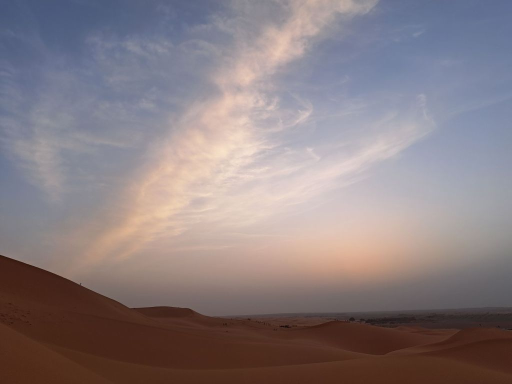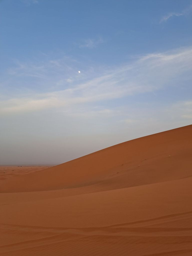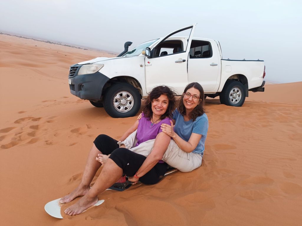 Un cop baixat el sol apareix al lluny el 4×4 de l’Omar que ve a buscar-nos i ens porta a una altra duna des d’on es veu el sol baixant a l’horitzó. Un cop el sol desapareix del tot ens ofereix baixar en tabla pel lateral de la duna cosa que fem de la manera més patética possible ja que a mig camí ens quedem clavades però ens vam fer uns riures.