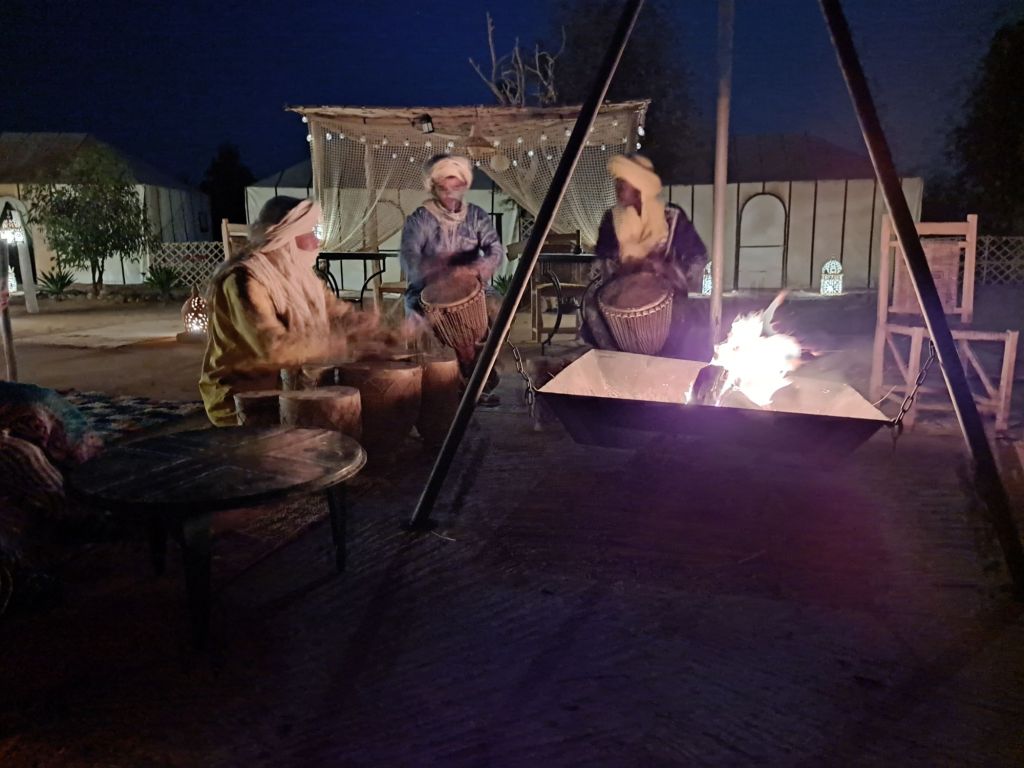 Sopem al jardi tot boníssim i acabem la nit al voltant d’una foguera amb els nois que treballen al campament tocant els bongos amb música tradicional i uns quants acudits per part d’Omar.