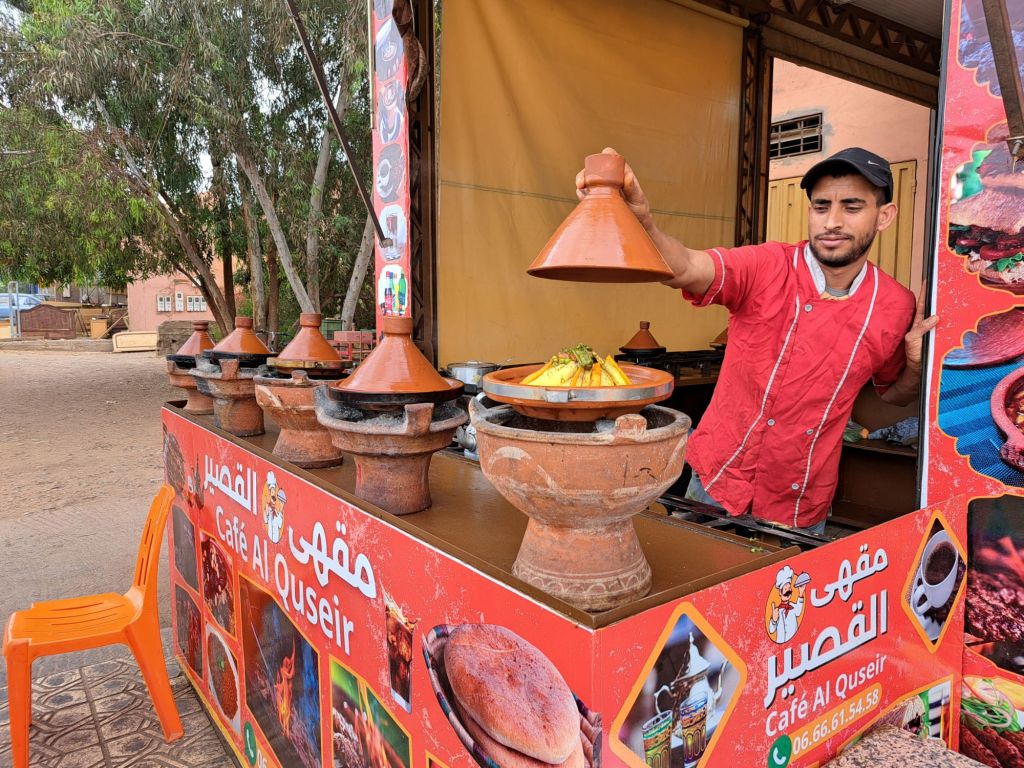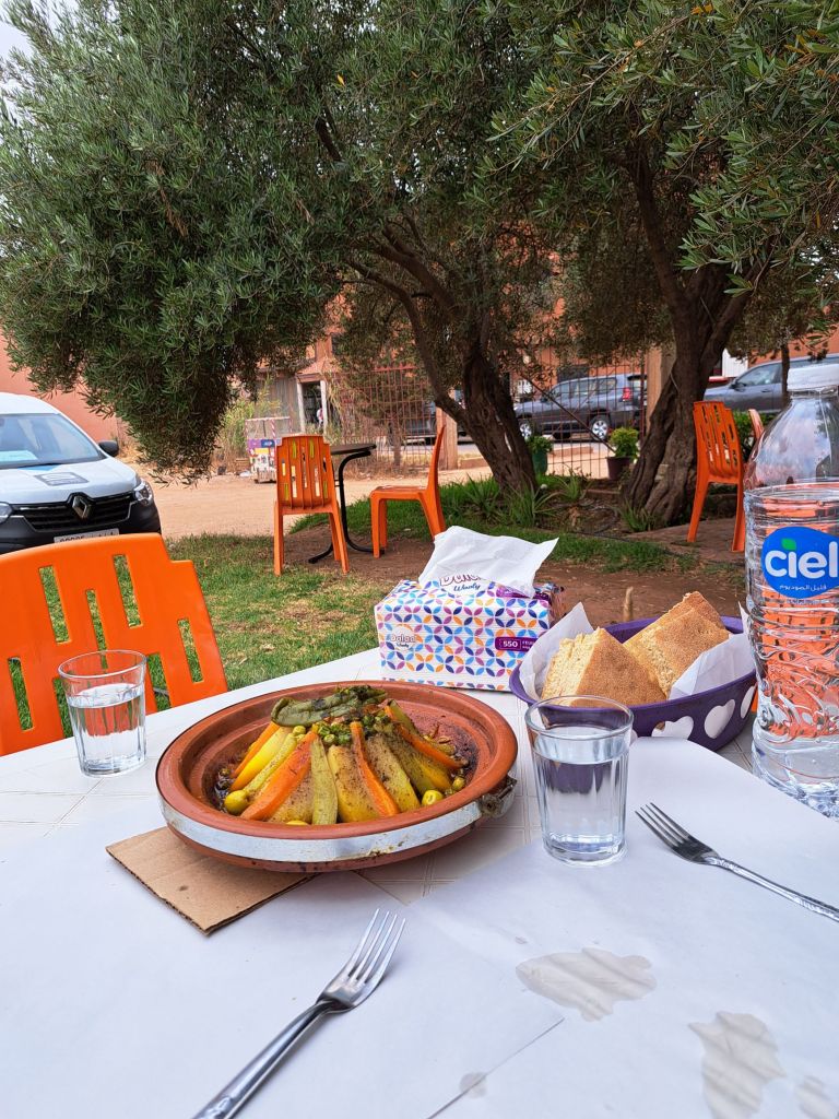 Quan ja ens hem encaminat hem parat a dinar en un poble on hi havien varis restaurants a tocar de la carretera. Malgrat tots tenien la mateixa estructura, una filera de tajins cuinant-se al costat d’unes neveres amb carn preparada per cuinar i uns xais penjats d’uns ganxos a l’aire fresc, la Cari (ma germana) ha escollit el que tenia menys pinta de poder ser turista. Després de preguntar el preu del tajin (6€) ens han convidat a seure a la part més endarrerida semblant a una sort de jardi des d’on de igual manera veiem la carretera. El tajin estaba boníssim i hem acabat amb un té. Com que ens sobrava pa i estava molt bo li hem comentat al senyor i ens ha portat dos trossos més perquè ens en duguessin. Ha sigut súper amable. En general estem tenint la sensació que la gent és molt amable i de moment no ens estan molestant gaire amb el tema d’anar darrere en plan comprame comprame.
