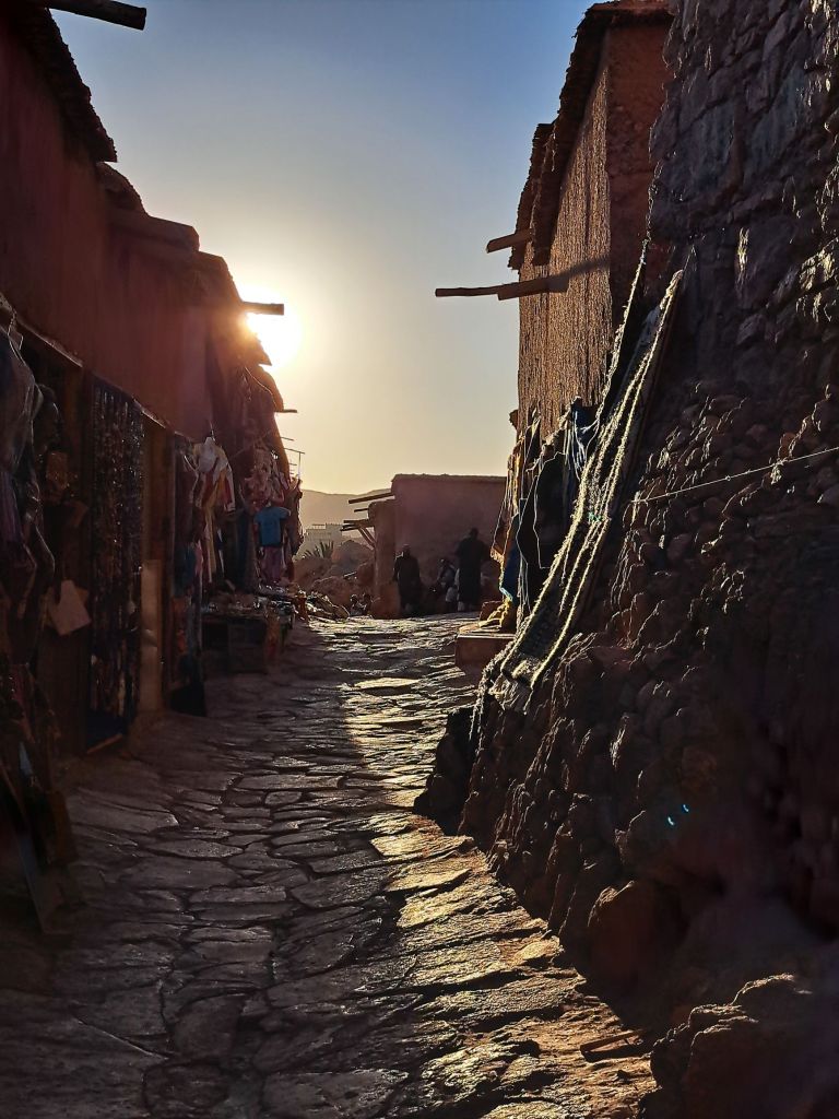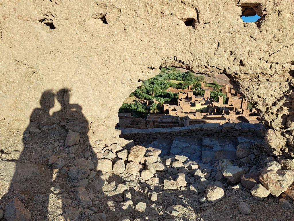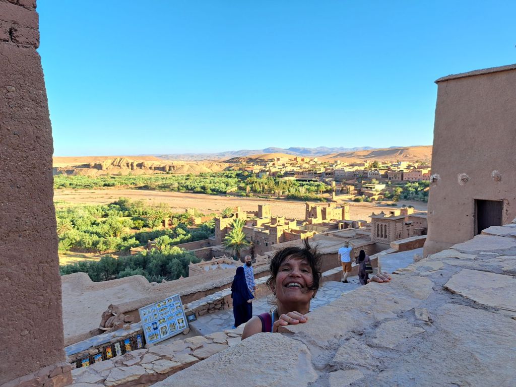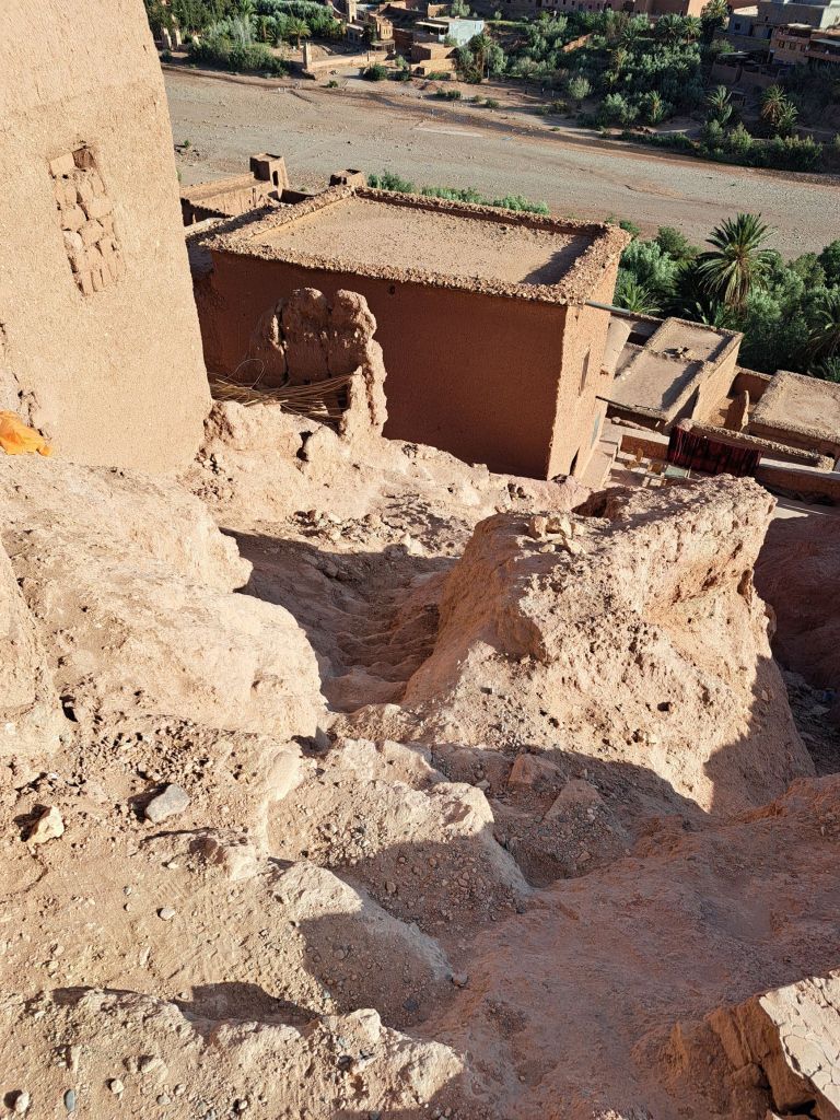 Finalment hem arribat a Ait Ben Haddou. Les Kasbah són fortaleses d’adob i són presioses. La zona n’està plena. Aquesta en qüestió està molt ben conservada. Evidentment és una visita turística i està plena de botiguetes de souvenirs. La Kasbah té una estructura laberíntica i puja per les laderes d’un turó. Quan hem començat a pujar hi ha hagut un moment que podies escollir camí. El què hem escollit passava per dins d’una mena de casa i al travessar-la per sortir per l’altre banda hi havia una senyora molt sonrient que ens ha demanat 10 dirhams (1€) a cadascuna. A partir d’aquí la pujada ha sigut força escarpada però hem arribat ràpit a dalt.